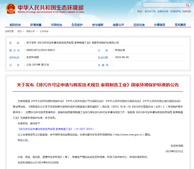 大气所牵头编制的国家环境保护标准《排污许可证申请与核发技术规范 家具制造工业》(HJ1027-2019)发布