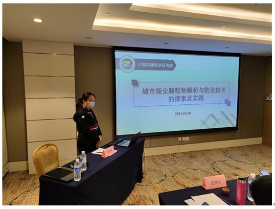 中国环境科学研究院竹双工程师作了题为《城市扬尘颗粒物解析与防治技术的探索及实践》的报告。她介绍了扬尘排放监测和表征方法,扬尘控制对策及控制效率,道路扬尘控制效率评估等,并重点讲解了“2+26”城市中渭南市、太原市等城市的扬尘治理案例。