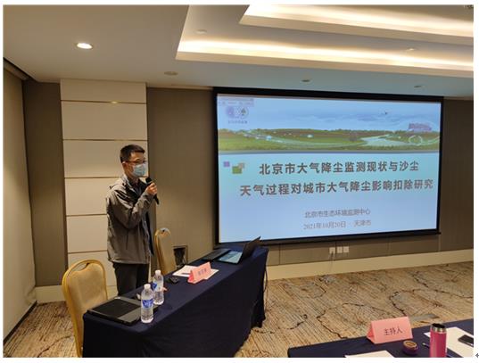 北京市生态环境监测中心刘兆莹高级工程师作了《北京市大气降尘监测现状与沙尘天气过程对城市大气降尘影响扣除研究》的报告。报告介绍了北京市降尘监测开展情况和沙尘过程对降尘影响的扣除方法,并展示了北京市2021年扣除沙尘天气影响的降尘量监测结果。