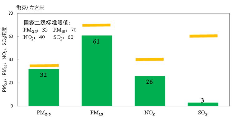 经过全市共同努力,2023年,北京市大气环境中四项主要污染物持续稳定达到国家空气质量二级标准。其中,细颗粒物(PM2.5)年均浓度为32微克/立方米,实现连续三年稳定达标;可吸入颗粒物(PM10)、二氧化氮(NO2)、二氧化硫(SO2)等其他三项主要污染物的年均浓度分别为61、26和3微克/立方米,均持续多年稳定达标。