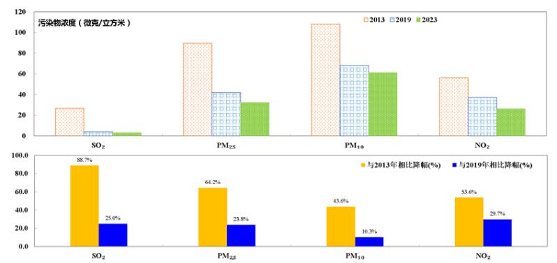 (图3 2013、2019、2023年四项主要污染物年均浓度变化)